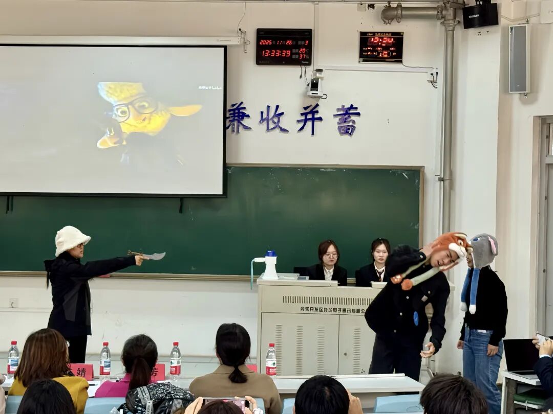 陈婧、张华慧、杨芳、杨迪、Goncalo Dias五位老师担任大赛评委。比赛设置单人组与多人组两个组别,经班级初选脱颖而出的24组选手晋级决赛。全体参赛选手以精湛的模仿技艺与得体的舞台风范,充分展现语言之美与艺术张力,为现场观众呈现了一场专业度与观赏性兼具的视听盛宴。