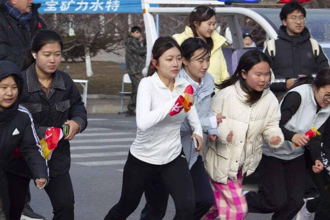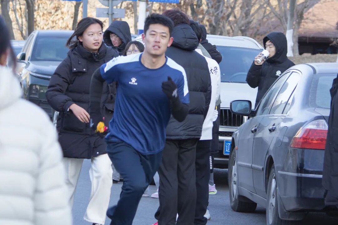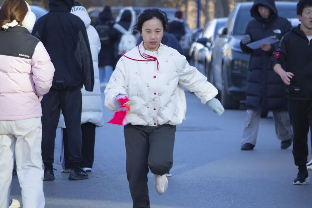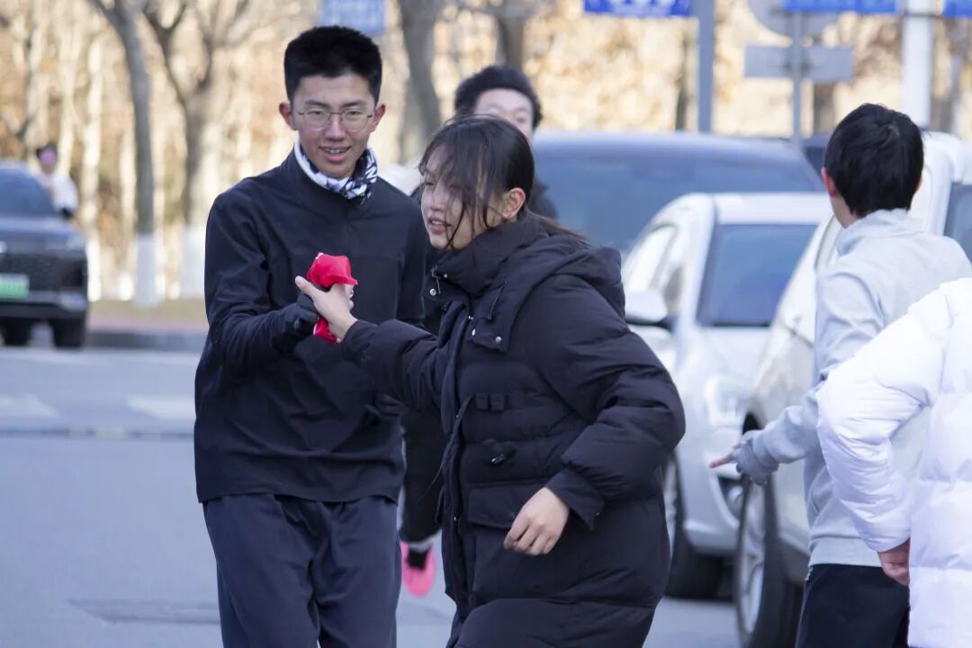 本次赛事起终点均设于承志楼前,赛道串联起校南门、承志楼、图书馆与明阳湖等校园地标。朔风凛冽的冬日里,参赛学子的热情分毫未减。赛场之上,高翻健儿们神采奕奕、意气风发,怀坚韧之志全力冲刺。首棒女队员佩戴彩带率先跃出起点,与队友完成行云流水的默契交接;各队员接棒后即刻提速,步履铿锵、斗志昂扬。每一次接力棒的交替,都传递着团队的信任与力量;每一名队员的奋力拼搏,都彰显着少年的毅力与担当,生动诠释出高翻学子团结协作、坚持不懈的精神底色。