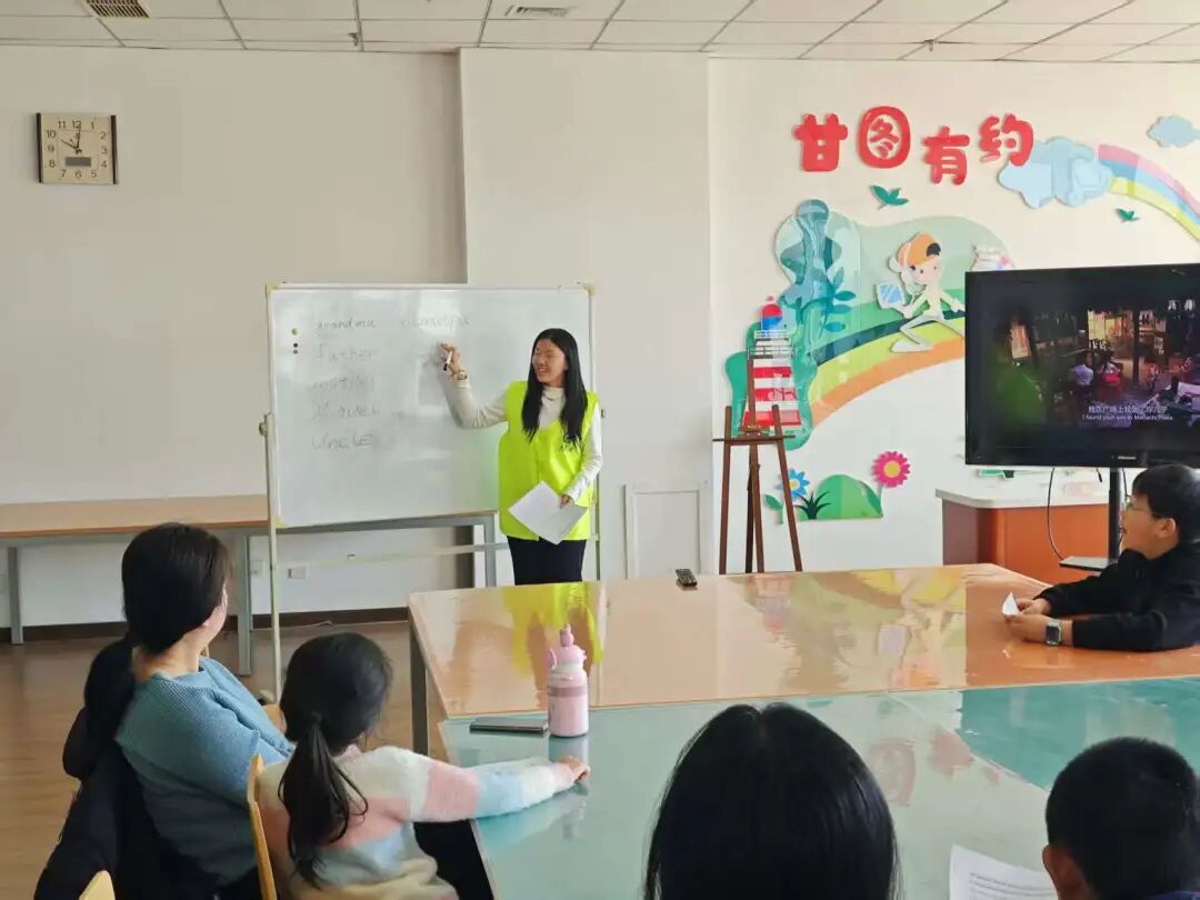 的郑墨涵同学担任主持。在开场环节,一段选自动画电影《Coco》的精彩片段迅速吸引了全场参与者的注意力。影片中,小主人公与家人之间的矛盾冲突,以及他对梦想的执着坚守,给大家留下了深刻印象。紧接着,主持人依托前期精心准备的教学材料,紧扣影片情节,引导大家学习与电影主题密切相关的重点词汇,帮助市民在轻松愉悦的氛围中夯实英语基础。
